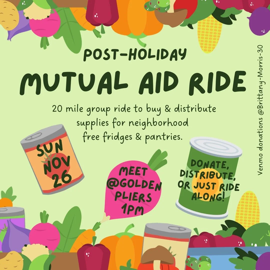 Join us for a chill group ride to help purchase and distribute food and mutual aid supplies. Meet at Golden Pliers at 1pm / 1:30 rollout. The 20 mile ride will stop at Grocery Outlet to pick up non-thanksgiving themed food, and loop back to end at the shop. After the grocery stop, we’ll distribute to free fridges/pantries throughout Portland. Buying/donating food is not a requirement to join the ride.